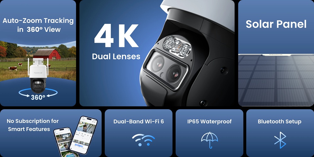 Dual-lens PTZ-camera | Dual-Band WiFi | Battery plus Solar Panel | Auto-Zoom tracking