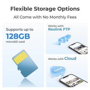 - Flexible storage options: local storage on micro SD card (max 128GB), FTP server or Reolink Cloud;
