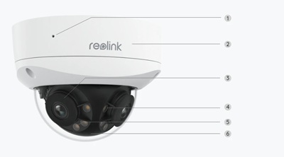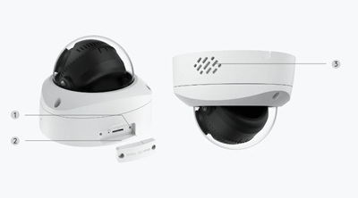 | 1) Microphone; 2) Logo; 3) Lens foam; 4) Spotlight & IR LED; 5) Spotlight & IR LED; 6)Daylight sensor. | 1) MicroSD card slot; 2) Reset button; 3) Speaker. |