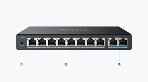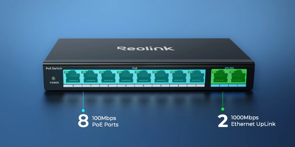 Reolink RLA-PS1 provides a reliable PoE solution featuring 8 PoE+ ports (10/100Mbps) and 2 Gigabit Ethernet uplink ports (10/100/1000Mbps). Compliant with IEEE802.3af/at standard, it can deliver up to 30W for each PoE port and has a total power budget of 120W for at most 8 PoE devices.