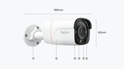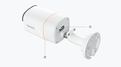 1) Mount; 2) Metal/aluminum case; 3) Daylight sensor; 4) Spotlight; 5) Lens; 6) Infrared LED | 1) Micro SD card slot; 2) Waterproof seal |