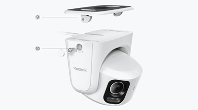 | 1) 'Up' sign; 2) Lens; 3) Infrared/white light; 4) Daylight sensor; 5) Microphone; 6) Reset button; 7) MicroSD card slot; 8) Speaker | 9) Mount; 10) Installation screws |