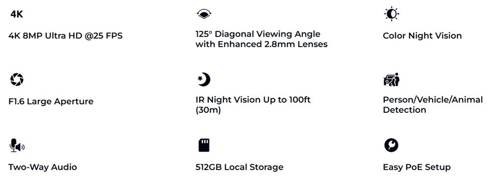 4K UHD resolution | Wide 125° diagonal viewing angle | Smart event detection | Perimeter protection