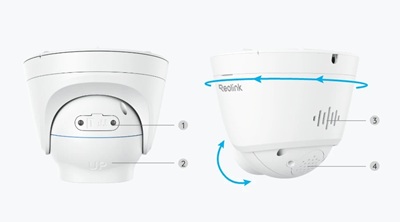 1) Mount; 2) Housing; 3) Spotlight; 4) Infrared LEDs; 5) Lens; 6) Daylight sensor | 1) MicroSD card slot; 2) 'Up' mark; 3) Speaker; 4) Vent |