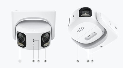 | 1) Lens; 2) Microphone; 3) Daylight sensor; 4) Spotlight & IR LED; 5) Speaker; 6) MicroSD card slot; 7) Reset button | 9) Mount; 10) Installation screws |