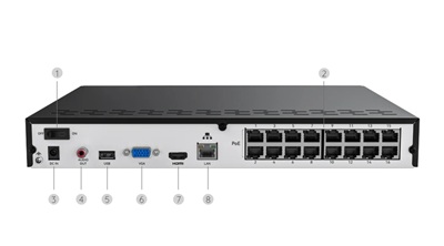| 1) USB-port; 2) Power LED; 3) HDD LED | 1) Power switch; 2) PoE ports; 3) Power input; 4) Audio out; 5) USB port; 6) VGA port; 7) HDMI port; 8) LAN port |